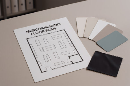 Merchandising floor plan document with color swatches and fabric sample on desk. Space for text.