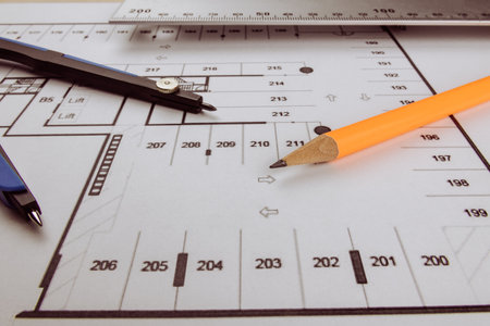 Architectural blueprints with a pencil and compass on the desk. Project being made Renovation blueprint compass ruler pencil
