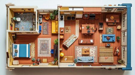 A beautifully designed dollhouse interior showcasing a detailed layout of a living room, kitchen, and bedroom. This cozy scene features intricate furniture and decor items that highlight creativity and warm ambiance, ideal for play or display.
