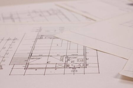 Paperwork and structure drawing plan in a room. New project architecture building in construction site.