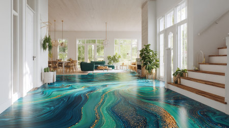 Digitally rendered image showcases a modern interior space with a stunning marbled floor in teal and gold tones. The design flows throughout the entire open-plan living area, creating a visually engaging and aesthetically pleasing atmosphere. The floor design is a contemporary interpretation of a marbled stone or resin look. Surrounding furniture and decorations contribute to the overall sophisticated and stylish feel of the room.