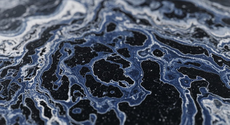 A close-up of the surface texture, showing fine particles and swirls in shades of blue against the deep black water. The scene is illuminated by soft light that highlights these intricate patterns. --ar 3:2 --v 6.1 Job ID: 4c90688c-0178-4d17-8ab5-80028a89ce3c