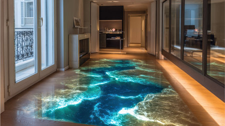 This interior showcases a creatively designed hallway with an artistic floor. The floor features a depiction of ocean waves in shades of blue and white, while a wooden bench adds an element of warmth. The image may be suitable for architectural, design, or decorative projects.