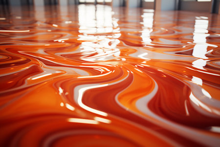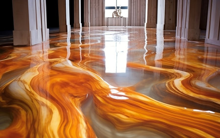 Reflective Swirls of an Orange and Black Epoxy Floor Inside a Large Hall with Person Walking