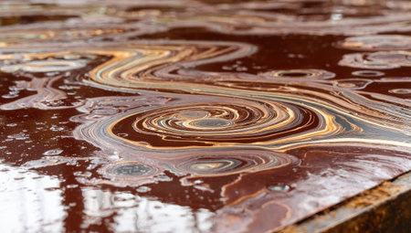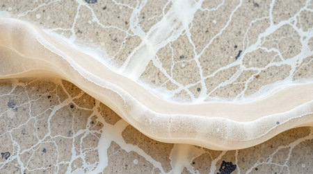 An overhead shot showcases a liquid surface with intricate swirling patterns in shades of brown and beige. The image features dynamic textures and a shallow depth of field. This visual could be used in design projects, advertising campaigns, or artistic illustrations.