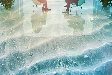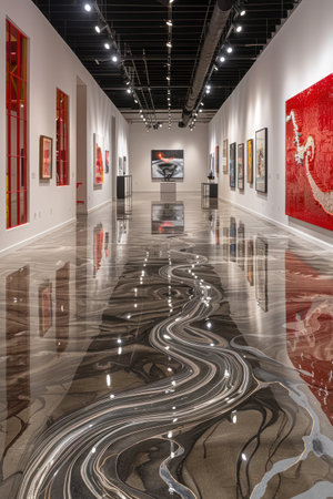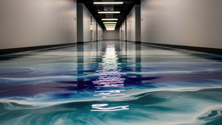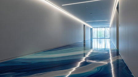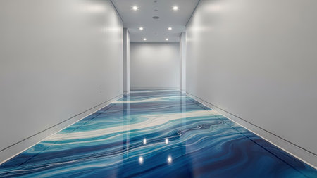 An interior hallway features a distinctive floor design mimicking flowing water. The space is illuminated by overhead lights, casting reflections on the glossy surface. The composition suggests a contemporary architectural design. The image could be suitable for architectural, design, or commercial projects.