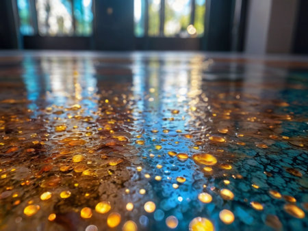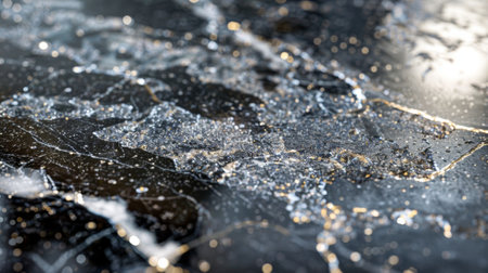 A stunning close-up of glitter particles scattered on a wet surface, capturing the dance of light and reflections creating a dreamlike ambiance.
