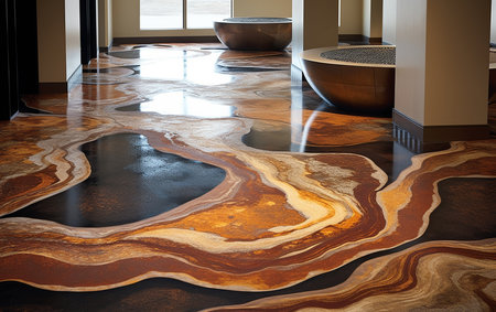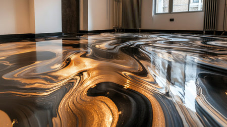 Luxurious marbled epoxy floor with metallic swirls, blending organic beauty and industrial style in a modern interior.