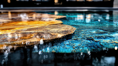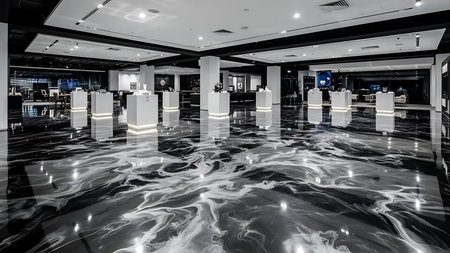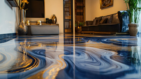 Marbled epoxy flooring in a luxury interior, seamless blend of organic and industrial design with high-end decor elements.