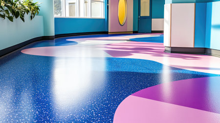 Bright and colorful abstract floor design in a modern indoor space combines vibrant colors with natural light to create an engaging environment.