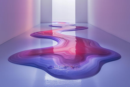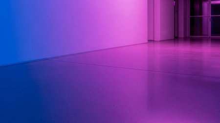 A minimalist interior space is captured with a focus on the highly polished floor. The surface reflects vibrant gradients of blue and pink light, creating a smooth, almost liquid appearance. The wall in the background is illuminated with a soft, diffused light, transitioning from blue to pink. The overall aesthetic is clean, modern, and abstract, emphasizing the interplay of light, color, and reflective surfaces in a contemporary architectural setting.
