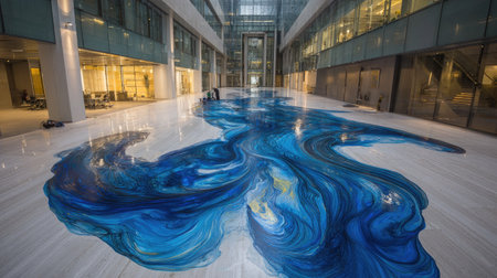 This interior showcases a contemporary design with a central sculpture and expansive windows. The space features a unique, reflective floor with blue and white tones. The lighting highlights the minimalist design and creates a clean aesthetic, ideal for various commercial and design projects.