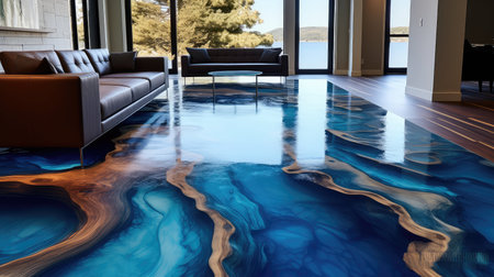 An interior space showcases a modern design featuring a unique epoxy floor with swirling blue and gold patterns. The room is filled with contemporary furniture and ample natural light. Its artistic design and neutral colors make it suitable for various commercial uses, including architectural and design projects.