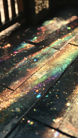 Charming Light Spectrum Display On Textured Timber Floor With Elegant Reflections And Natural Beauty