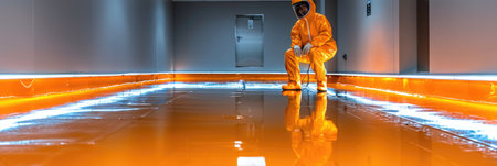 A man, fully dressed in a protective suit, is currently kneeling down on a vibrant and bright orange floor as part of his work task