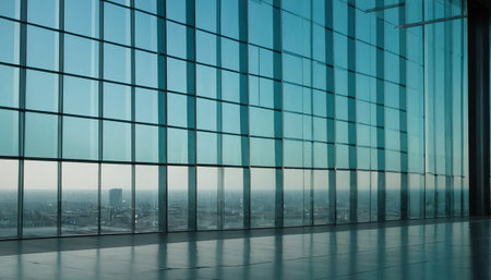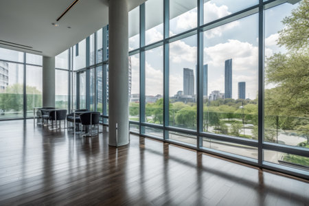 An interior space features expansive glass windows and doors, offering a view of the outside. The composition presents a clean aesthetic with a focus on natural light. Suitable for commercial purposes, the image may be used to illustrate architectural design, concepts of space, or a sense of openness.