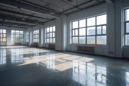 Large industrial hall with large windows and floor illuminated by rays of light