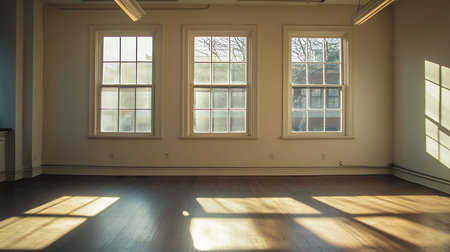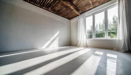 A bright, minimalist room featuring large windows casting soft shadows. This empty space is perfect for creatives seeking an inspiring and serene environment.