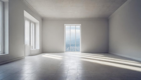 This image captures a bright, empty interior with minimalist design, featuring smooth white walls, expansive windows letting in ample sunlight, and a neutral color palette, ideal for modern