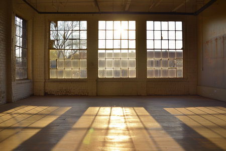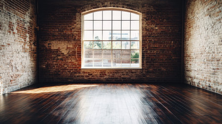 Beautiful sunlight pours through rustic brick windows in an industrial space, casting stunning light patterns on the floor, creating a warm and inviting atmosphere perfect for photography.
