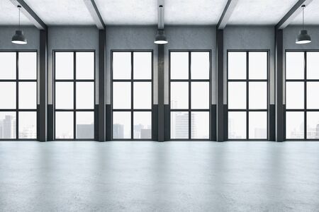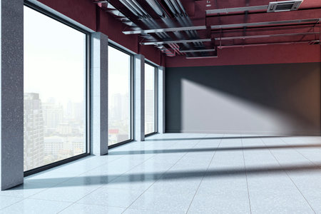 Empty contemporary office room with large windows, tiled floor, and exposed ceiling on urban city background. Concept of modern workspace. 3D Rendering
