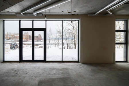 The room is under construction with a rough finish, plastered walls, concrete floor. Wiring of ventilation pipes on a concrete ceiling and panoramic windows in a building under construction.