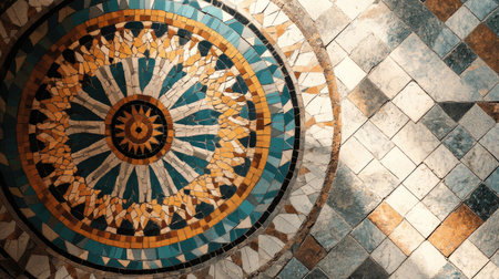 Multi colored mosaic tile flooring in ancient ornate built structure generated by artificial intelligence