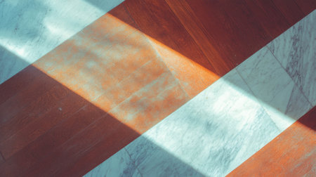 An interior shot features a patterned floor with a play of light and shadow. The design incorporates rectangular shapes and linear elements with color contrast. The lighting creates a contrast between light and dark areas. This image can be used for commercial projects such as backgrounds, or conceptual illustration.
