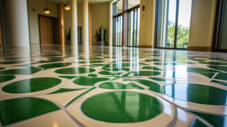This image showcases a modern interior featuring a vibrant green geometric floor pattern in a bright, spacious environment. The sleek design invites tranquility and creativity.