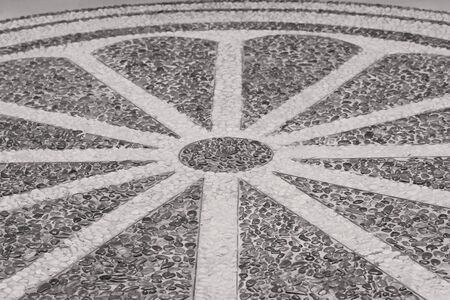 An artistic view of a decorative manhole cover positioned amidst a striking geometric paving pattern of black, white, and yellow tiles in an urban setting.