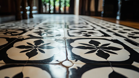 Close-up of intricate black and white encaustic tiles with floral patterns on a polished floor