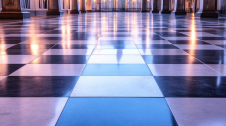This captivating image showcases a glossy checkered floor in a grand hall, reflecting warm light and highlighting elegant architectural details.