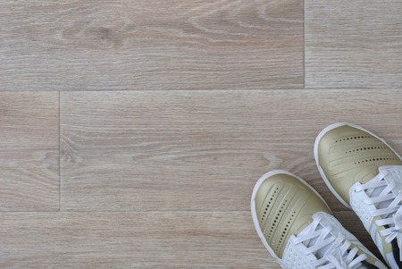 White sneakers on the wooden floor. Top view, copy space.