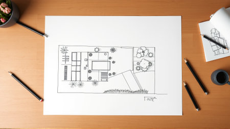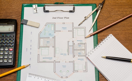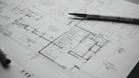 A close-up shot of a detailed floor plan drawing on a drafting table, with other tools and papers surrounding it. The drawing is of a buildings interior layout with several rooms and doors. The lighting in the image suggests a sunny day, casting shadows on the paper and surrounding items.