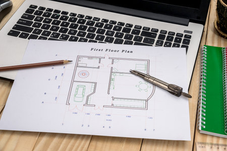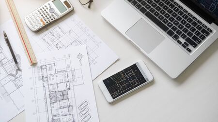 black pencil and computer laptop on architectural drawing paper for construction