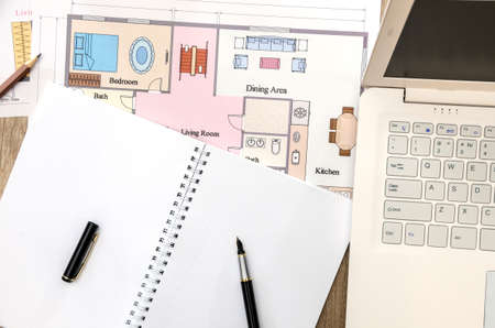 Digital tablet with house plan on table at home office. Home planning concept.