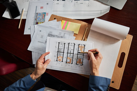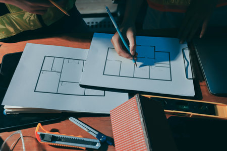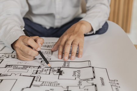 Top aerial view of project manager or civil engineer writing at blueprint and planning building design. Aerial view of architect working together at meeting table with document placed.