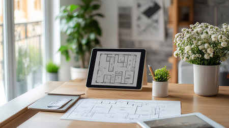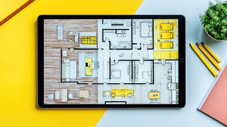 A sleek digital tablet displays a detailed modern interior design floor plan, surrounded by vibrant stationery and a decorative plant, enhancing a creative workspace ambiance.