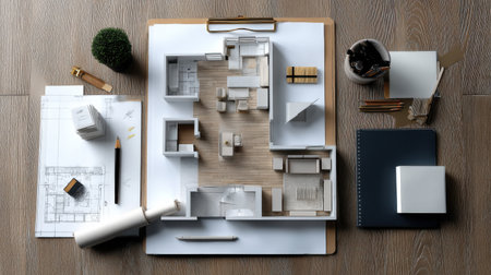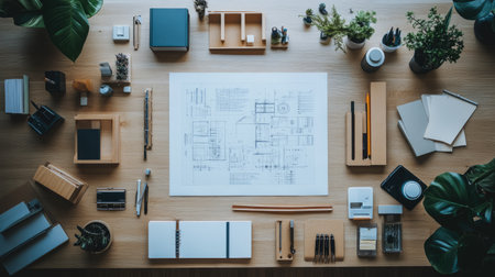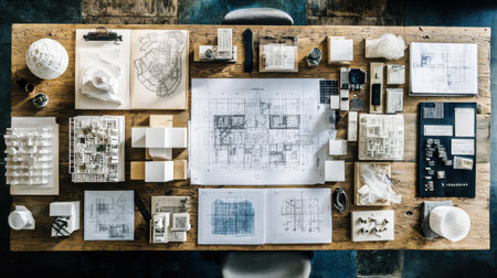 An organized architectural workspace featuring models, sketches, and tools, showcasing a blend of creativity and functionality for design projects.