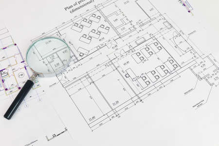 Construction drawing and magnifying glass The desk architect