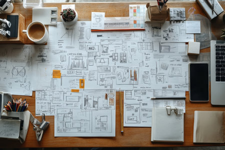 Architectural plans and sketches displayed on a desk with a cup of coffee nearby