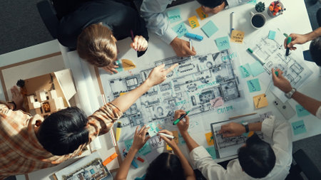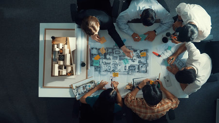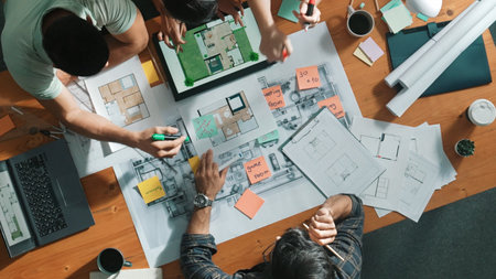 Top down view of manager writing at blueprint while marketing team plans design. Aerial view of architect engineer working together sharing idea and taking a note in project plan at table. Symposium.
