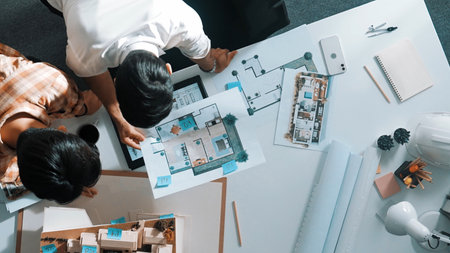 Top down of skilled business people holding tablet an looking at blueprint. Aerial view of architect engineer planning and design house design together while standing at table with laptop. Symposium.