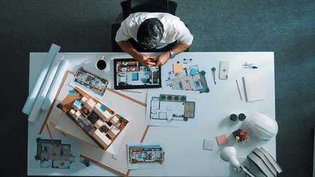 Top view of business man using tablet plan house design while sitting at meeting table with blueprint and equipment scatter around. Aerial view of civil engineer working at blueprint.