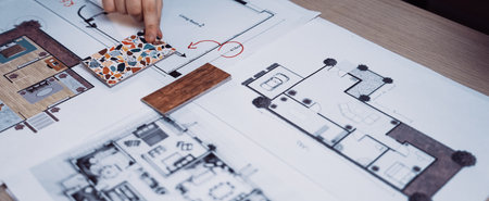 A modern workspace showcases architectural design plans with colorful samples and a hand holding a pencil, reflecting creativity and organization in project planning.