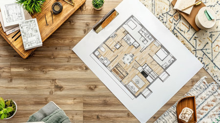 A flat lay of an architectural blueprint on a rustic wooden table, accompanied by creative tools and a steaming mug of coffee, perfect for design and planning inspiration.