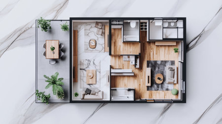 A stunning aerial view of a modern apartment showcasing an open layout with a cozy living room, sleek kitchen, and inviting bedrooms. Bright natural light enhances the space.