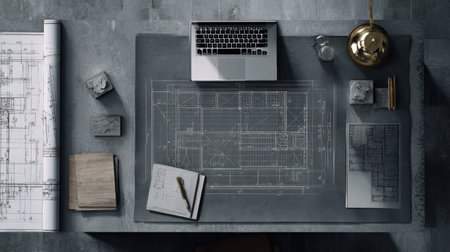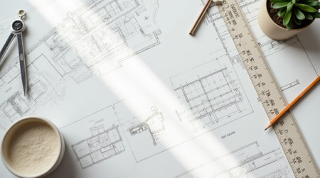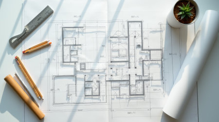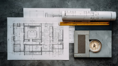 A creative workspace featuring detailed architectural blueprints and tools, showcasing the intricate planning and design process in construction projects. Perfect for design-related themes.