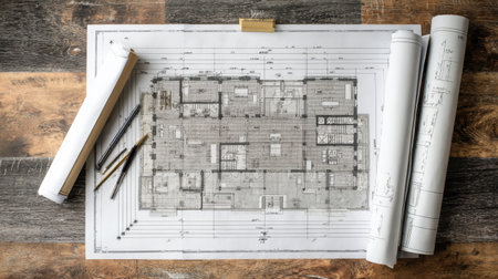 This image showcases a detailed architectural blueprint displayed on a wooden surface, surrounded by drafting tools and rolled plans, emphasizing the design process and construction planning.