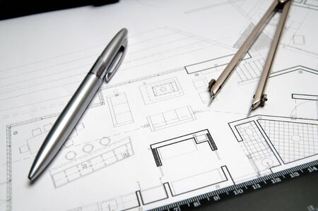House interior drawing with scale ruler and pen, Close up